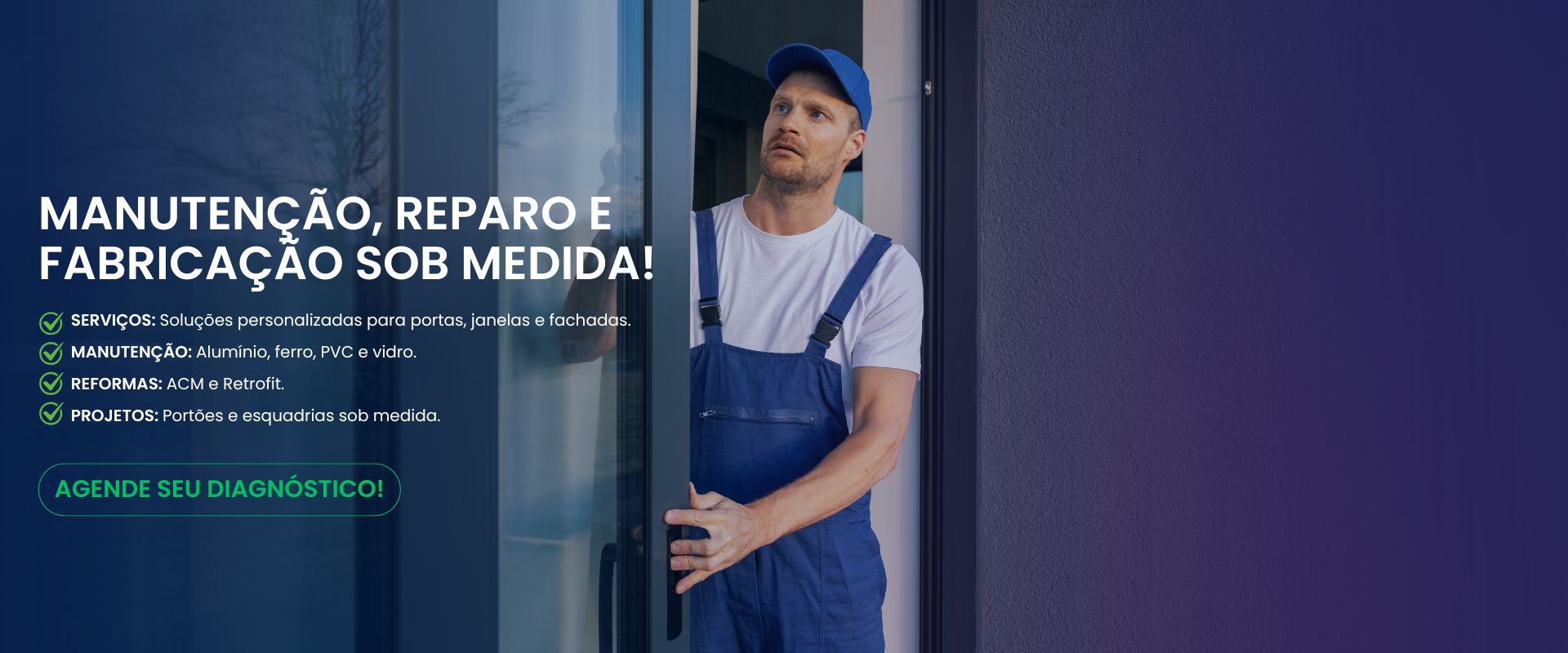 Oferecemos manutenção e fabricação de esquadrias, portas, janelas e fachadas com soluções personalizadas. Trabalhamos com ferro, alumínio, PVC e vidro temperado, garantindo qualidade e durabilidade.